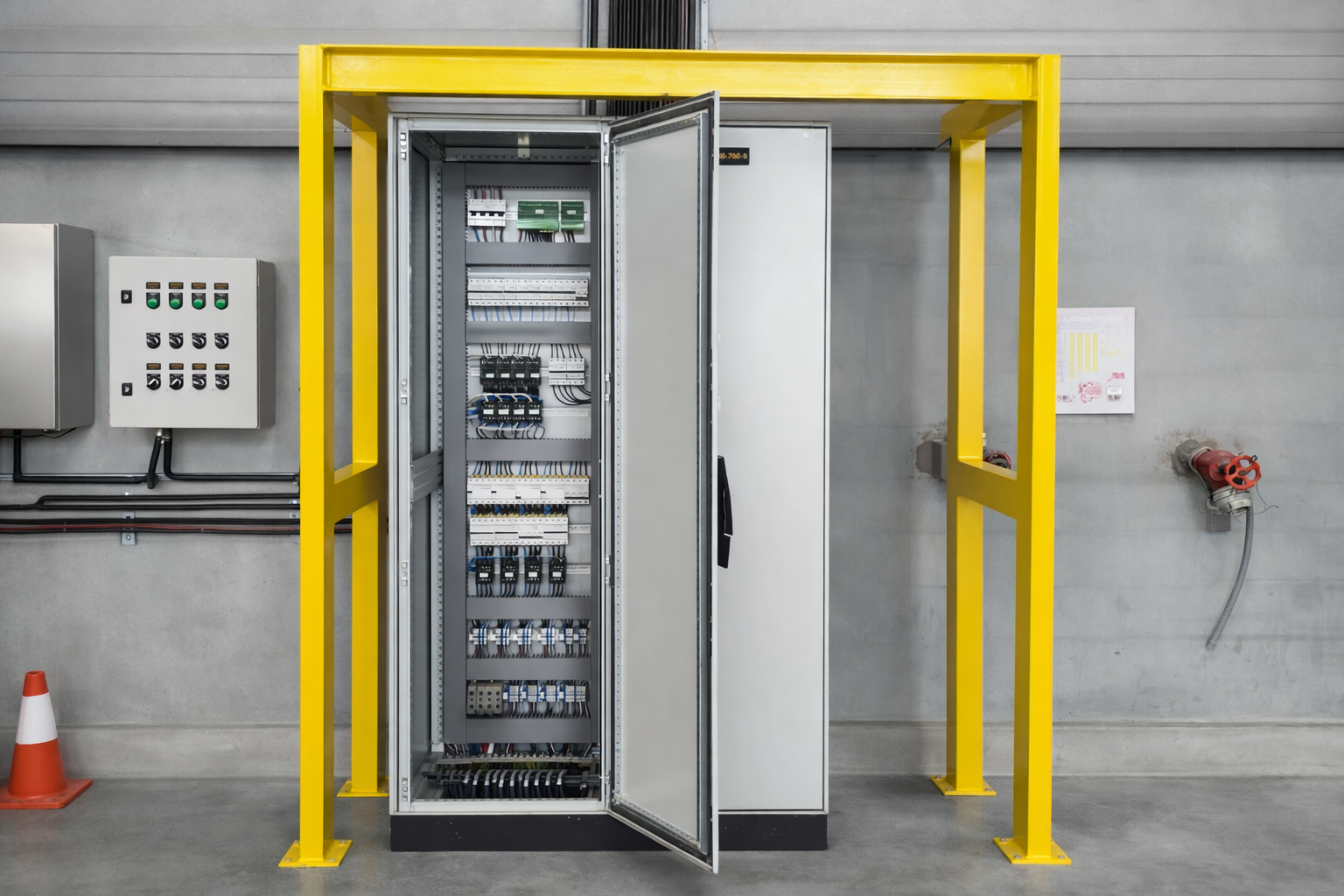 The installation covered circuits for indoor/outdoor lighting, automatic doors/gates, signage, and ventilation/extraction, delivered with full documentation.